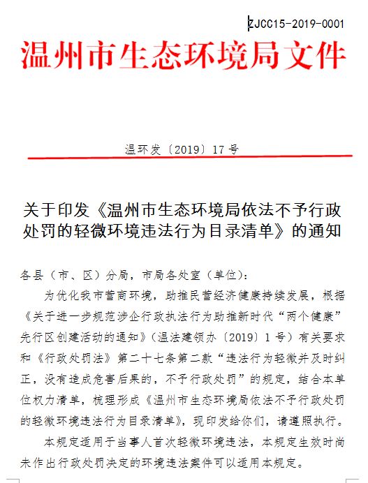 为优化我市营商环境,助推民营经济健康持续发展,今天,温州市生态环境局印发了《温州市生态环境局依法不予行政处罚的轻微环境违法行为目录清单》。01