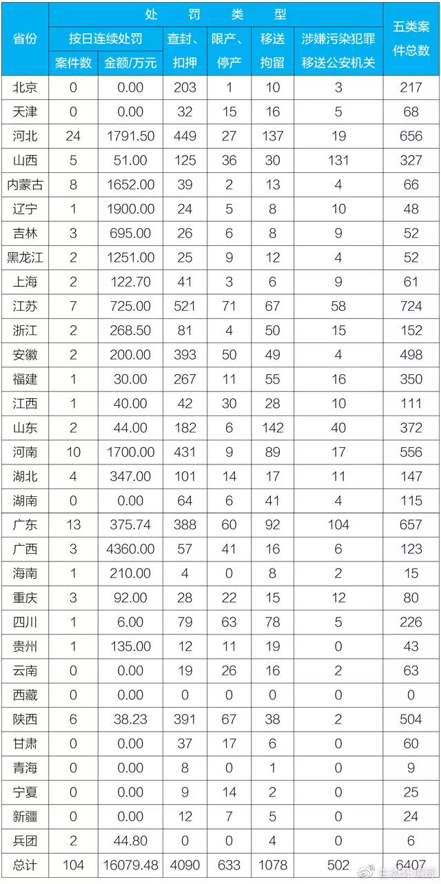 2019年1-4月,全国共查处五类案件6407件。其中,按日连续处罚案件104件,罚款金额16079.48万元;查封、扣押案件4090件;限产、停产案件633件;移送行政拘留1078起;移送涉嫌环境污染犯罪案件502件。