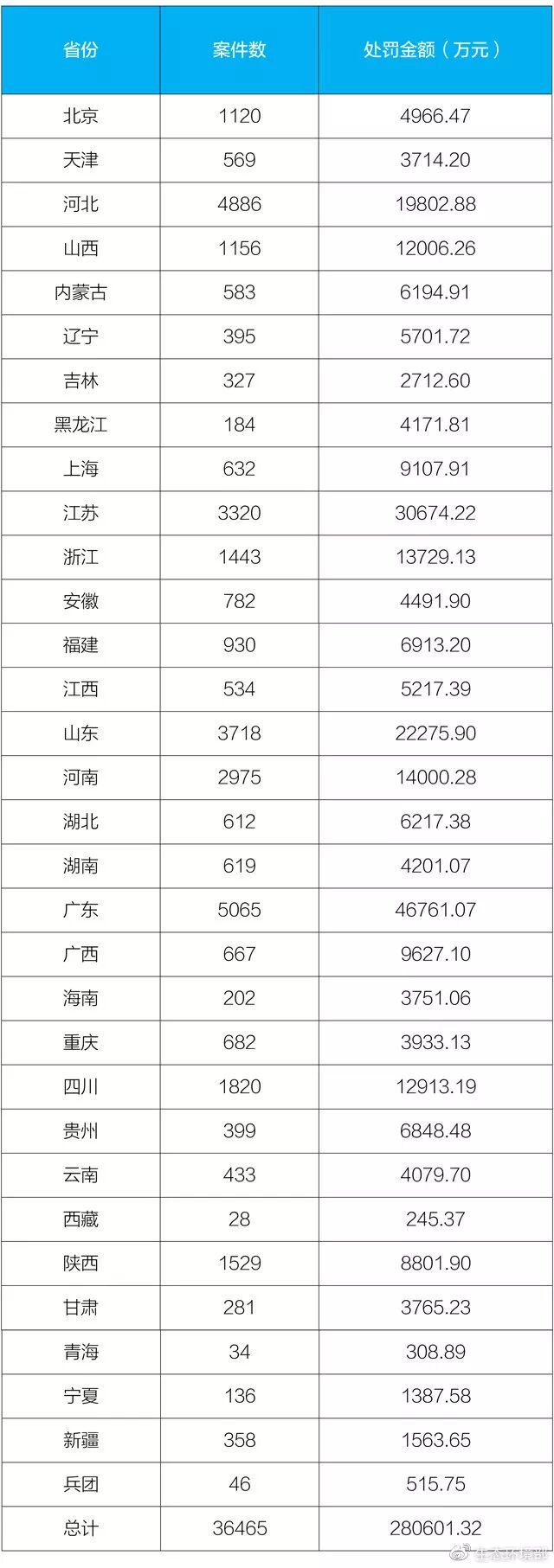 2019年1-4月,全国共下达处罚决定书36465份,罚款金额28.06亿元,案件平均罚款金额7.70万元。