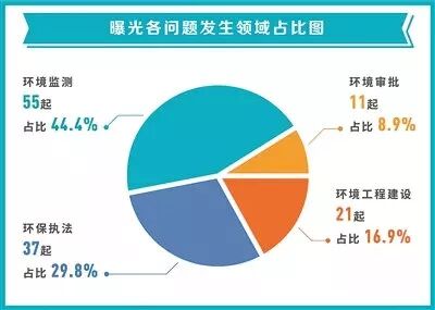 从问题发生领域看,环保领域形式主义、官僚主义问题主要发生在环境审批、环境监测、环保执法和环境工程建设等领域。其中,发生在环境监测领域的55起,占比44.4%;发生在环保执法领域的37起,占比29.8%;发生在环境工程建设的21起,占比16.9%;发生在环境审批领域的11起,占比8.9%。