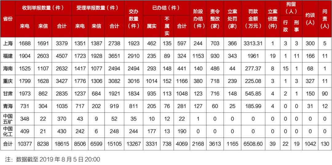 截至8月5日晚20:00,各督察组共收到群众来电、来信举报18615件,受理有效举报15105件,经梳理合并重复举报,累计向被督察地方和中央企业转办13267件,已办结4069件、阶段办结2168件。其中立案处罚1165家,罚款6508.60万元;立案侦查39件,拘留41人;约谈党政领导干部1042人,问责130人。从被督察地方和中央企业边督边改具体情况看,海南、福建、青海等地群众举报不实率较高,两家央企下属企业具体生态环境问题推动整改力度不够,需要引起重视。