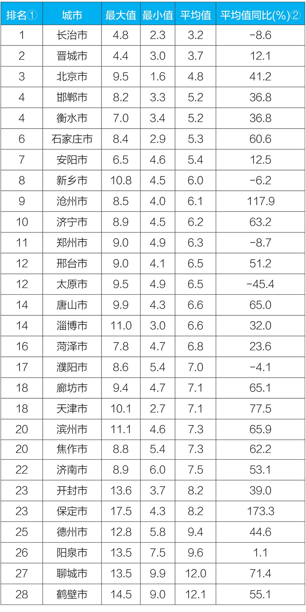 注:①按2019年11月“2+26”城市降尘量平均值从小到大进行排名。下表同。