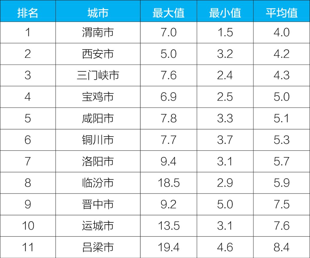 11月,汾渭平原11城市降尘量均值范围在4.0–8.4吨/平方千米·月之间,平均为5.7吨/平方千米·月。汾渭平原11个城市降尘量平均值均小于9.0吨/平方千米·月。其中吕梁市降尘量平均值最大,达8.4吨/平方千米·月。临汾等5个城市降尘量最大值大于9.0吨/平方千米·月。(汾渭平原11城市11月降尘监测结果详见附表2。 )