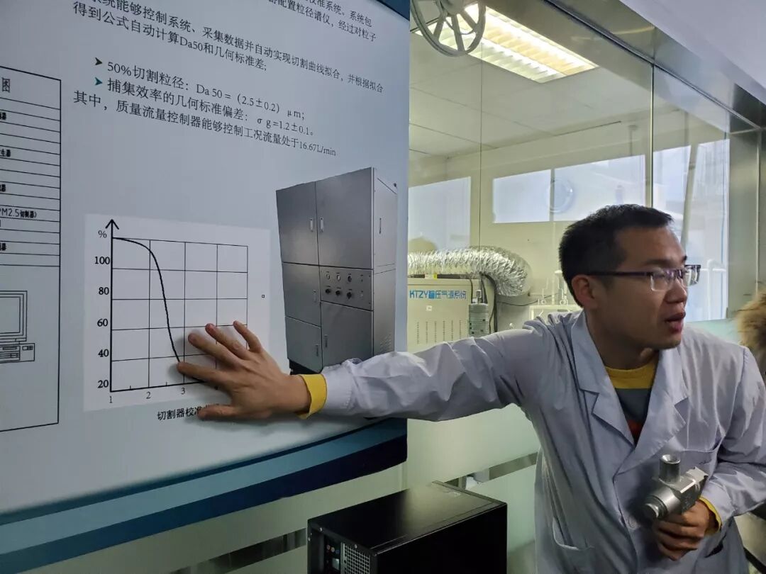 工作人员在向记者介绍监测设备工作原理