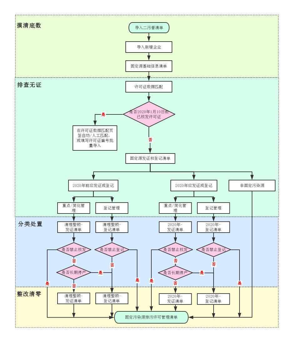 “摸”——摸清底数,确保不留遗漏。“二污普”清单的排污单位产排污信息全、覆盖广、信息准,需要全部导入清理整顿信息系统,并纳入排污许可管理。考虑到二污普清单范围是2017年12月31日前已建成的企事业单位清单,清理整顿工作还需要地方通过原排污费征收、企业自主验收、工商管理、电力等其他途径摸排补充“二污普”清单缺失的排污单位,形成全面的固定污染源基础信息清单。