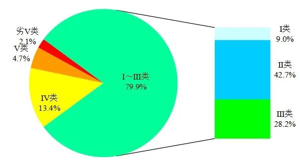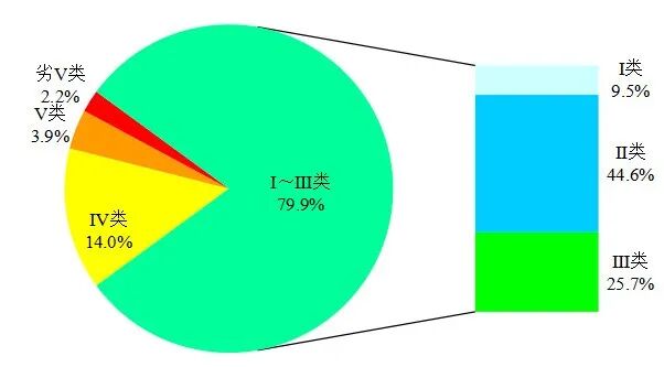 1-3月,1940个国家地表水考核断面中,水质优良(Ⅰ-Ⅲ类)断面比例为79.9%,同比上升5.6个百分点;劣Ⅴ类断面比例为2.2%,同比下降3.8个百分点。主要污染指标为化学需氧量、总磷和氨氮。