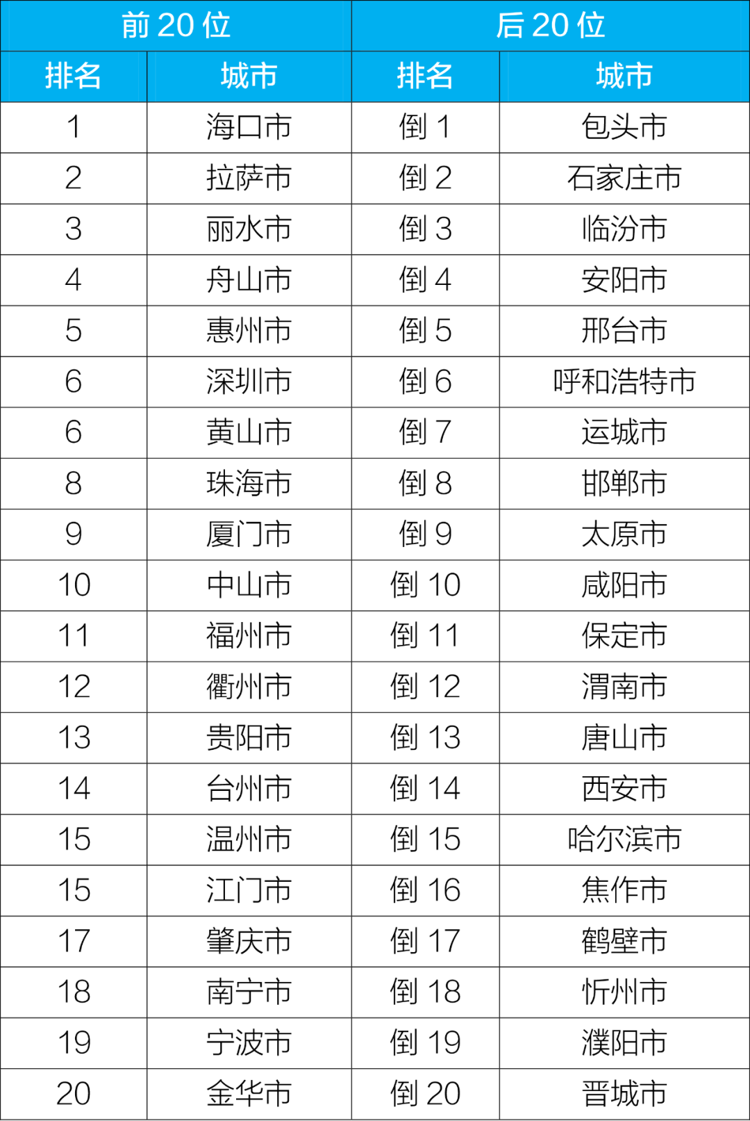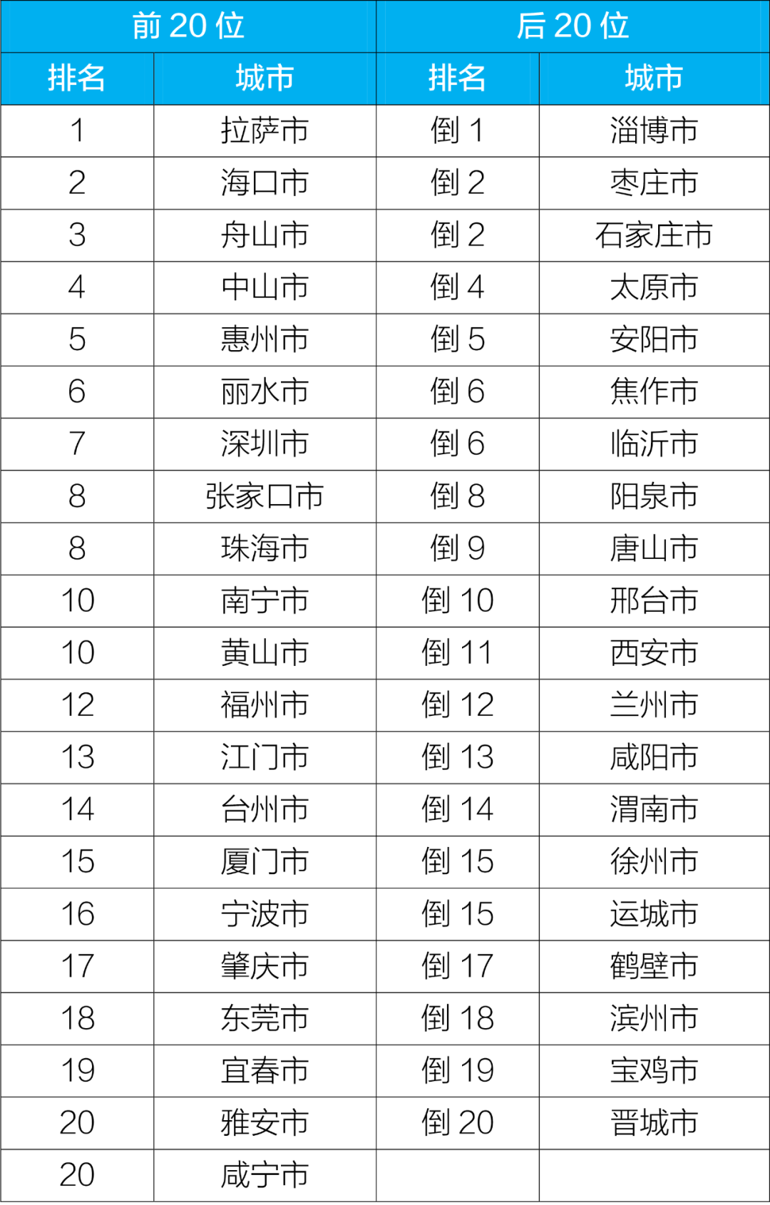 1-3月,168个重点城市中包头、石家庄、临汾市等城市空气质量相对较差(从倒数第1名至倒数第20名);海口、拉萨、丽水市等城市空气质量相对较好(从第1名至第20名,见附表8)。