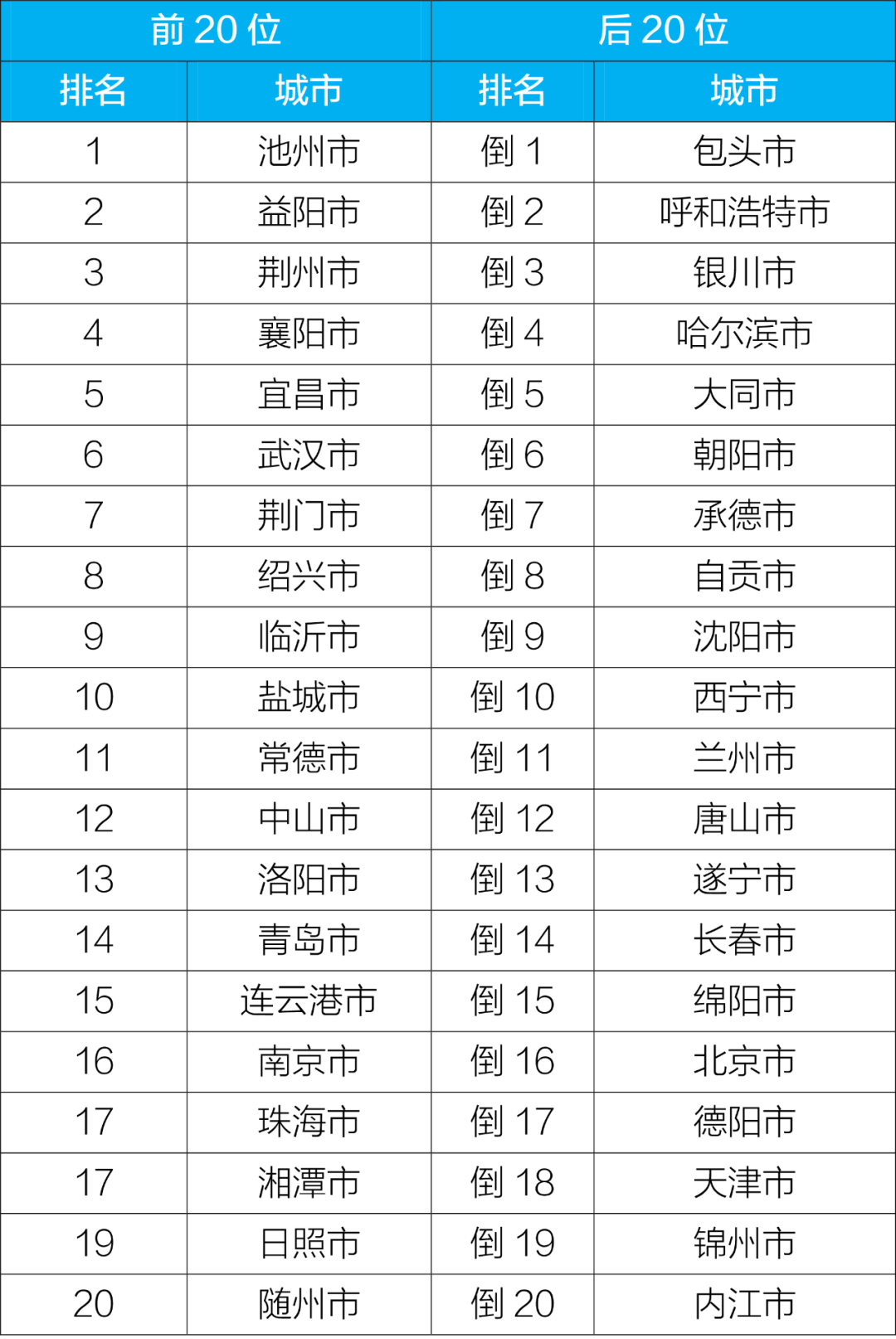 1-3月,168个重点城市中包头、呼和浩特、银川市等城市空气质量改善幅度相对较差(从倒数第1名至倒数第20名);池州、益阳、荆州市等城市空气质量改善幅度相对较好(从第1名至第20名,见附表9)。