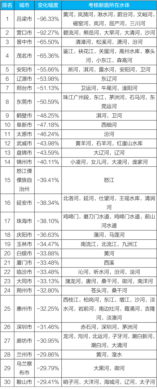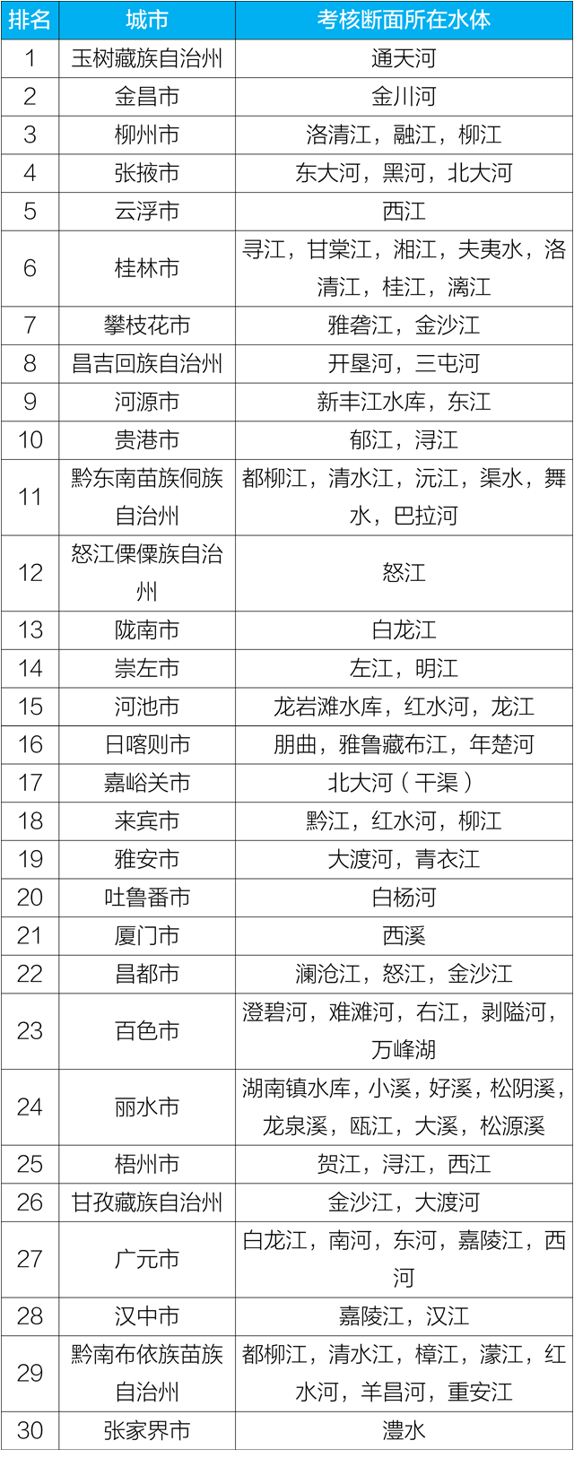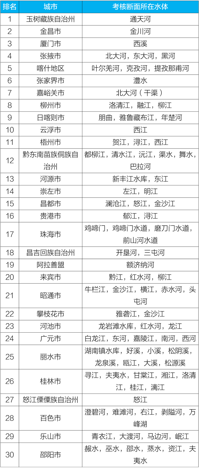 2020年3月国家地表水考核断面水环境质量状况排名前30位城市及所在水体