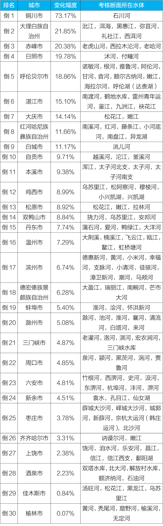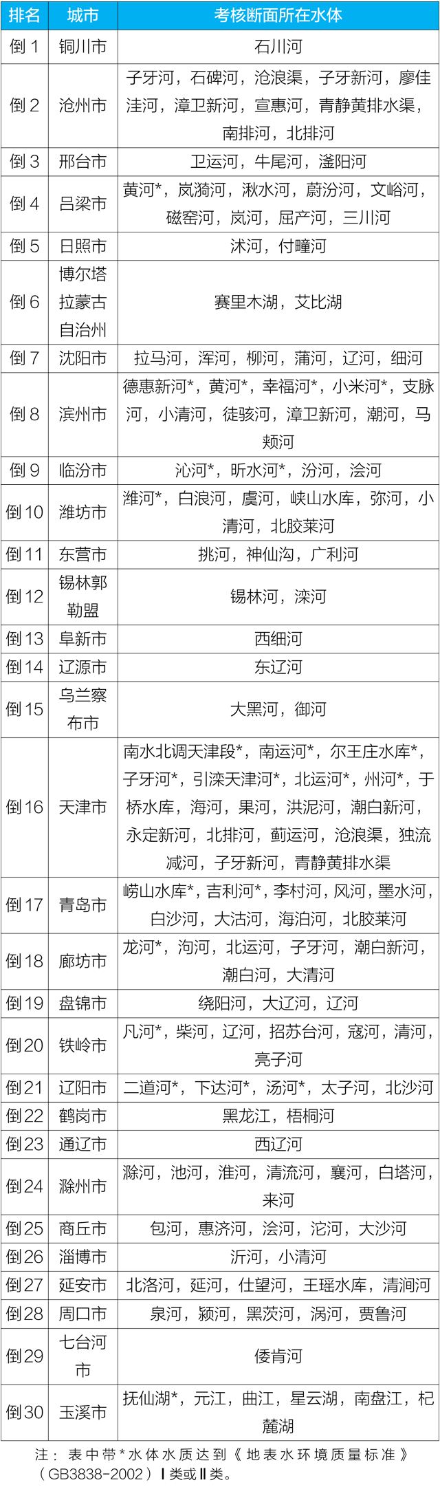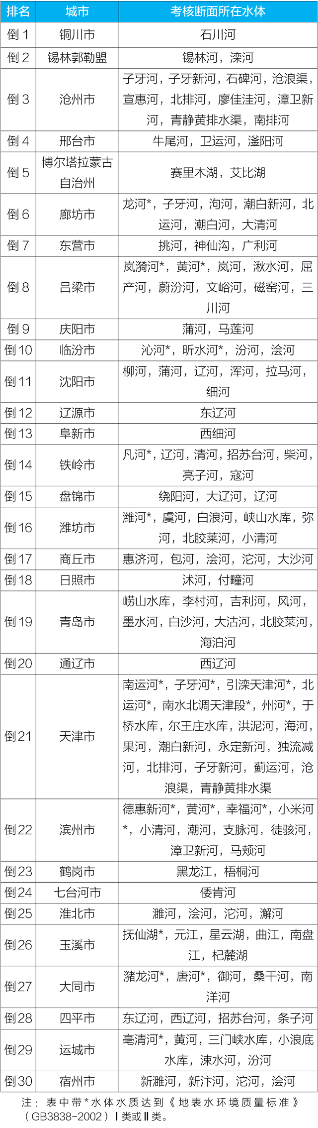 2020年3月国家地表水考核断面水环境质量状况排名前30位城市及所在水体