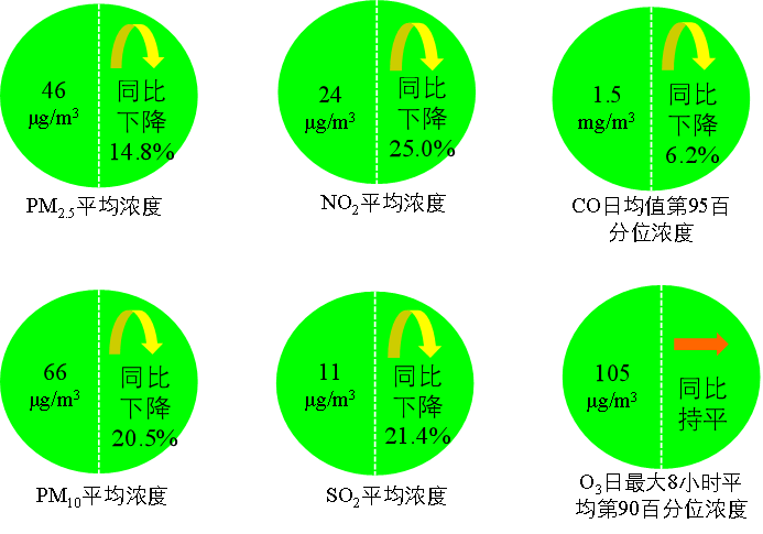 3月,全国337个地级及以上城市平均优良天数比例为93.5%,同比上升5.2个百分点;PM2.5浓度为32微克/立方米,同比下降22.0%;PM10浓度为59微克/立方米,同比下降20.3%;O3浓度为115微克/立方米,同比下降0.9%;SO2浓度为10微克/立方米,同比下降16.7%;NO2浓度为23微克/立方米,同比下降23.3%;CO浓度为1.0毫克/立方米,同比下降16.7%。