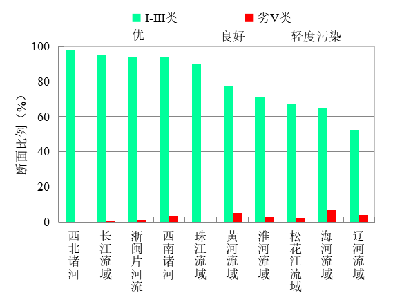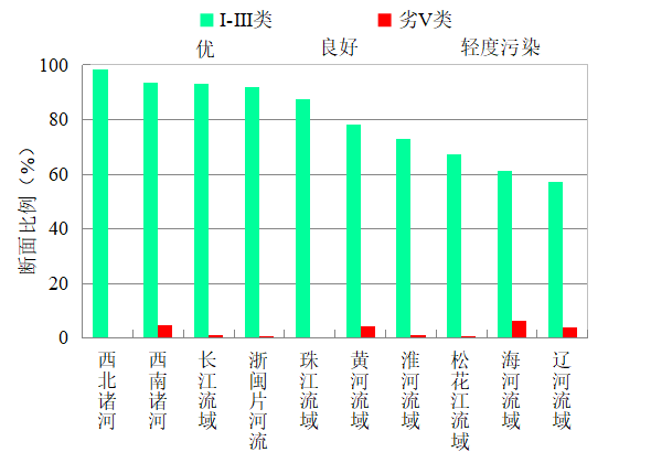 1-3月,长江、黄河、珠江、松花江、淮河、海河、辽河等七大流域及西北诸河、西南诸河和浙闽片河流Ⅰ-Ⅲ类水质断面比例为82.8%,同比上升6.5个百分点;劣Ⅴ类为2.1%,同比下降4.6个百分点。主要污染指标为化学需氧量、氨氮和高锰酸盐指数。其中,西北诸河、长江流域、浙闽片河流、西南诸河和珠江流域水质为优,黄河流域水质良好,淮河、松花江、海河和辽河流域为轻度污染。