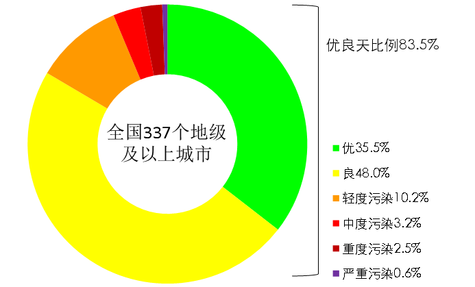 1-3月,全国337个地级及以上城市平均优良天数比例为83.5%,同比上升6.6个百分点;120个城市环境空气质量达标,同比增加24个;PM2.5浓度为46微克/立方米,同比下降14.8%;PM10浓度为66微克/立方米,同比下降20.5%;O3浓度为105微克/立方米,同比持平;SO2浓度为11微克/立方米,同比下降21.4%;NO2浓度为24微克/立方米,同比下降25.0%;CO浓度为1.5毫克/立方米,同比下降6.2%。