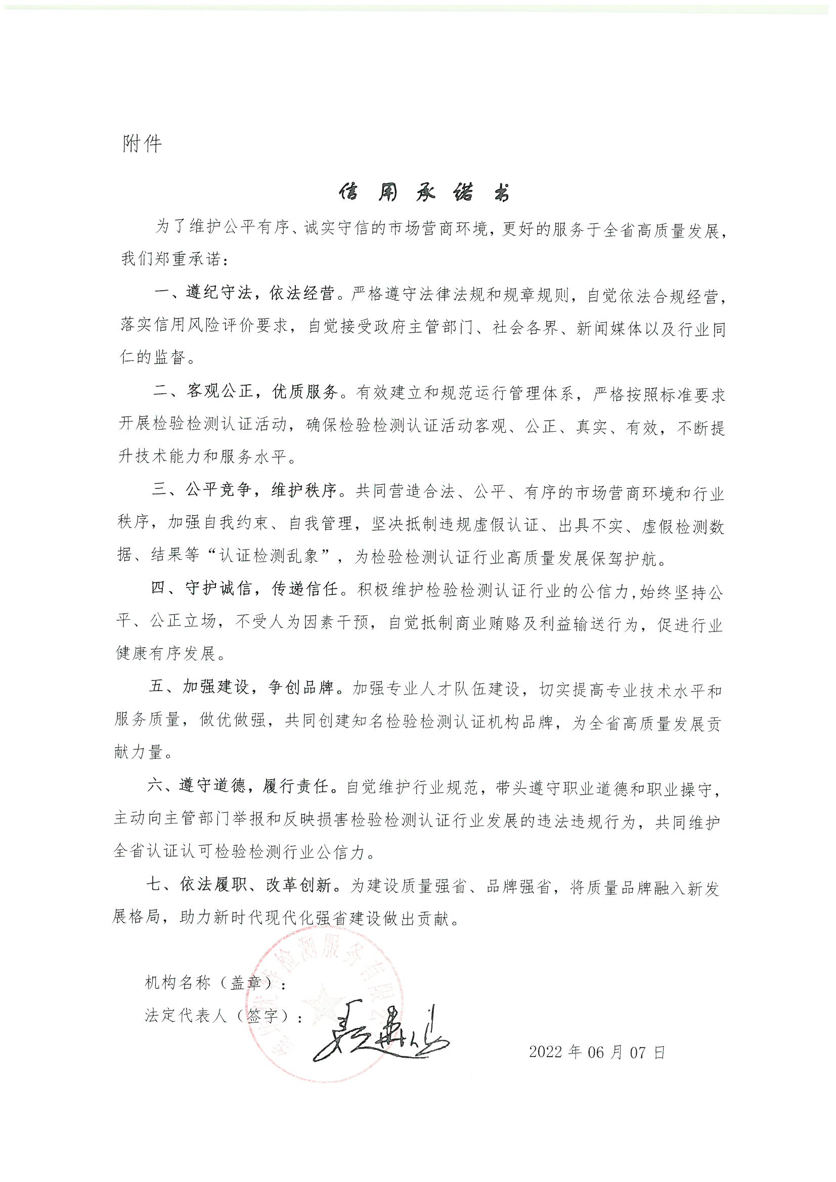 在第 15 个“世界认可日”来临之际,为提高认证机构、检验检测机构技术服务能力,营造良好的市场环境、竞争环境、消费环境,响应广大民众对诚信检验检测、质量安全的相关诉求,传递质量信任,服务绿色发展,本公司积极响应山东省认证认可协会号召,积极参与“世界认可日信用承诺主题活动”并签订《信用承诺书》。