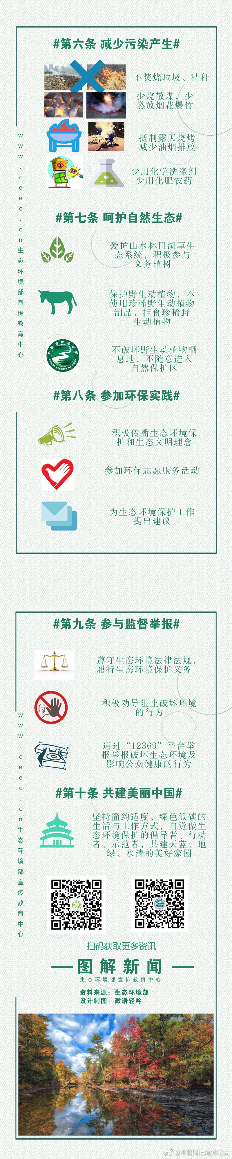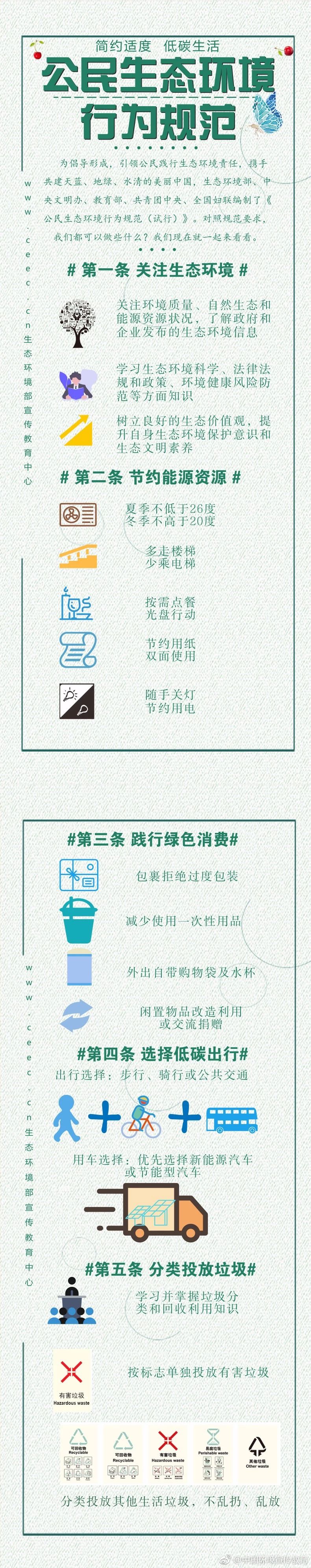 为倡导形成简约适度、绿色低碳的生活方式,引领公民践行生态环境责任,携手共建天蓝、地绿、水清的美丽中国,生态环境部、中央文明办、教育部、共青团中央、全国妇联编制了《公民生态环境行为规范(试行)》。日常生活中,我们都可以做些什么呢?一起来看看。