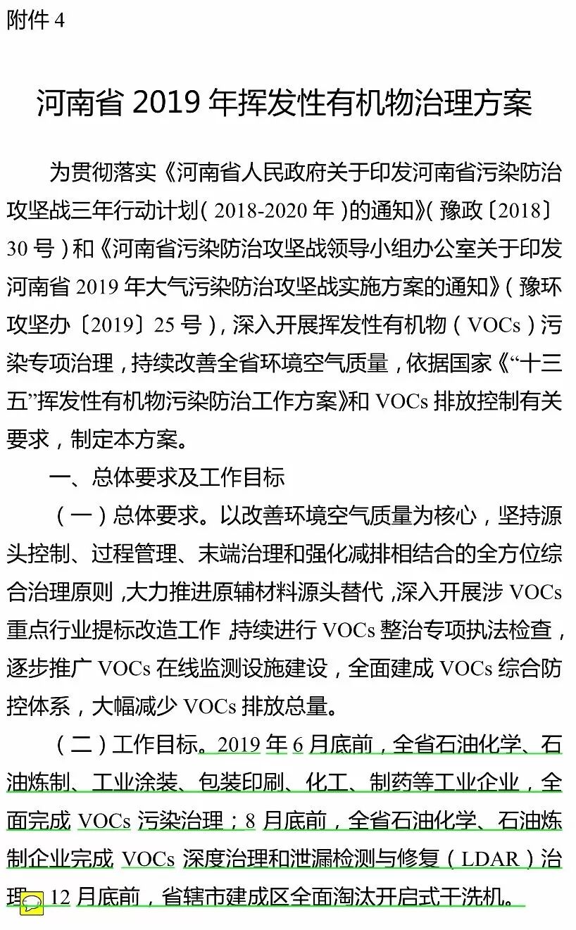 《河南省2019年挥发性有机物治理方案》(简称方案),明确提出了“坚持源头控制、过程管理、末端治理和强化减排相结合的全方位综合治理原则,推进原辅材料源头替代、开展涉VOCs重点行业提标改造工作、VOCs整治专项执法检查、推广VOCs在线监测设施建设,建成VOCs综合防控体系,减少VOCs排放总量”的总体要求。同时,明确提出“2019年6月底前,全省石油化学、石油炼制、工业涂装、包装印刷、化工、制药等工业企业,全面完成VOCs污染治理;8月底前,全省石油化学、石油炼制企业完成VOCs深度治理和泄漏检测与修复(LDAR)治理;12月底前,省辖市建成区全面淘汰开启式干洗机”的工作目标。